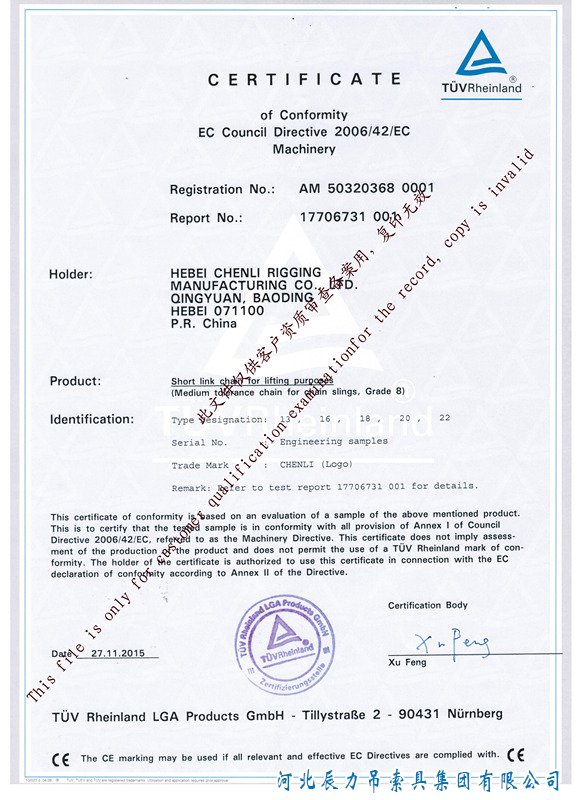 辰力起重鏈條生產(chǎn)商是中國(guó)***,也是一家獲得CE起重鏈條認(rèn)證的廠家。CE起重鏈條是一種安全認(rèn)證的標(biāo)志,是辰力起重鏈條制造商打開并進(jìn)入歐洲市場(chǎng)的護(hù)照。在歐盟市場(chǎng)“CE”標(biāo)志屬?gòu)?qiáng)制性認(rèn)證標(biāo)志,不論是歐盟內(nèi)部企業(yè)生產(chǎn)的起重鏈條,還是其他***生產(chǎn)的起重鏈條,要想在歐盟市場(chǎng)上自由流通,就必須加貼“CE”標(biāo)志。